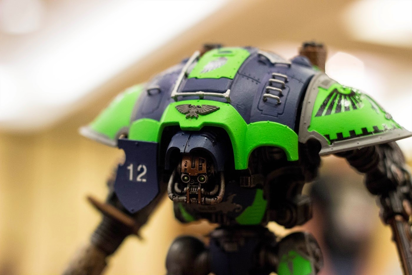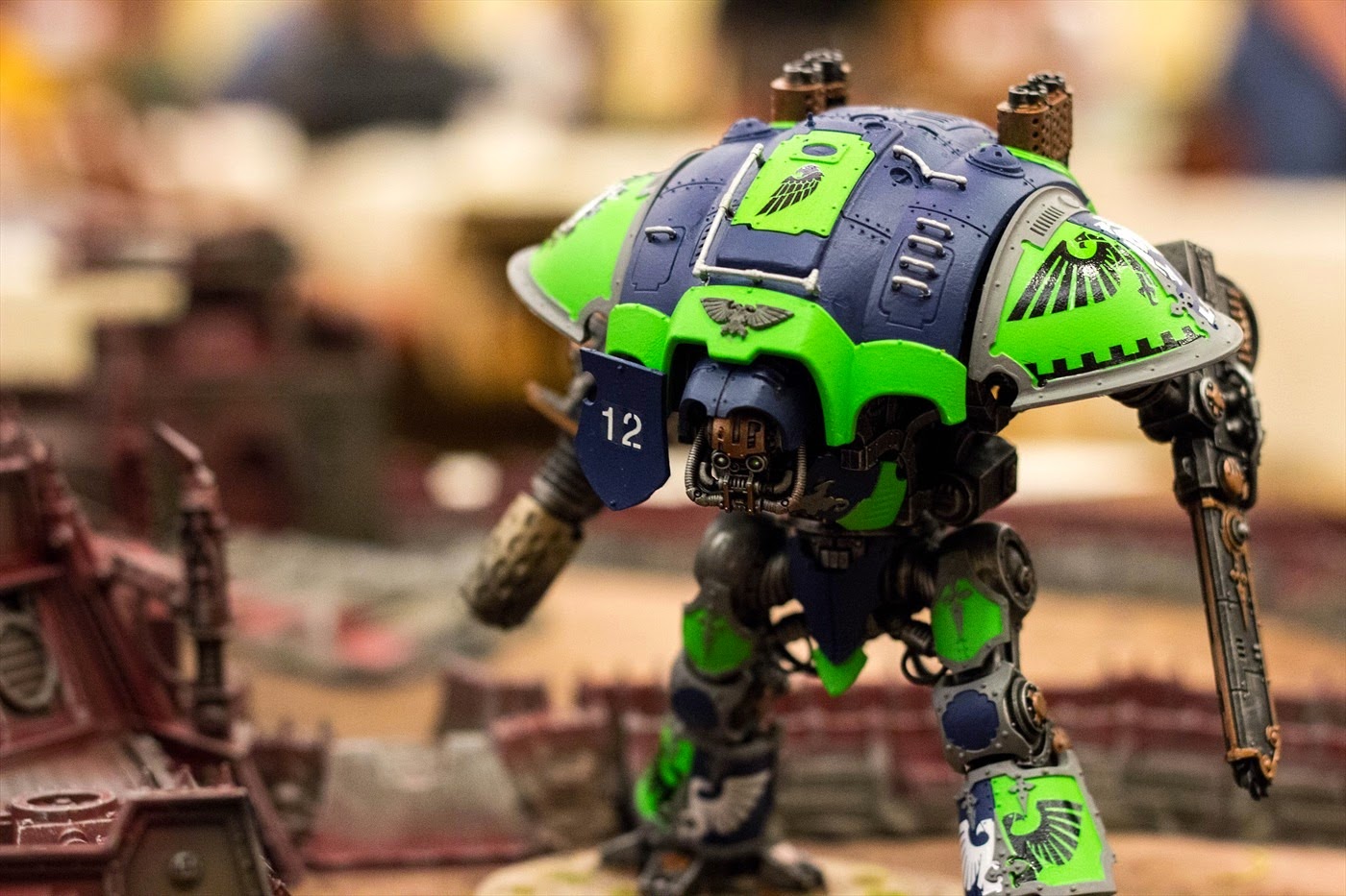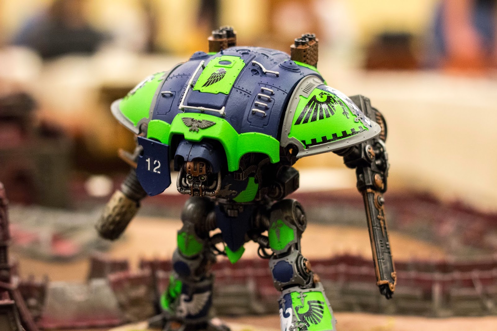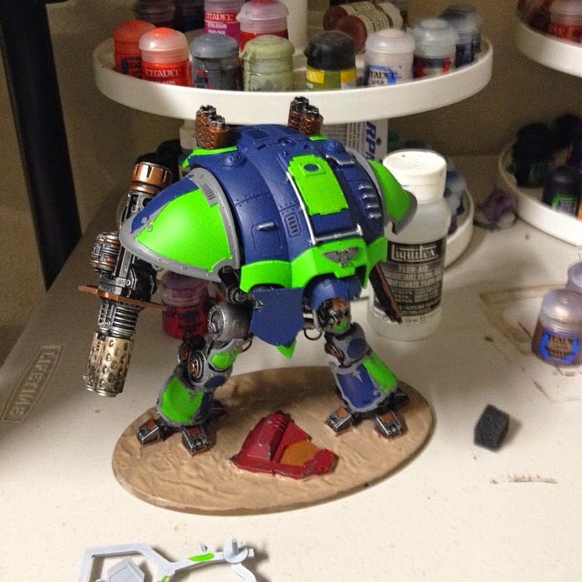 Most of the way through. I decided to try out the crackle paint that GW is making, mostly because I didn't have enough time to do anything more detailed. This was the day before the convention so I needed to wrap it up pretty quickly. I also decided to add some details to the base painting in a certain local team's colors.